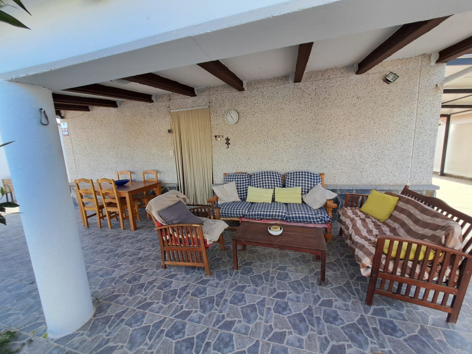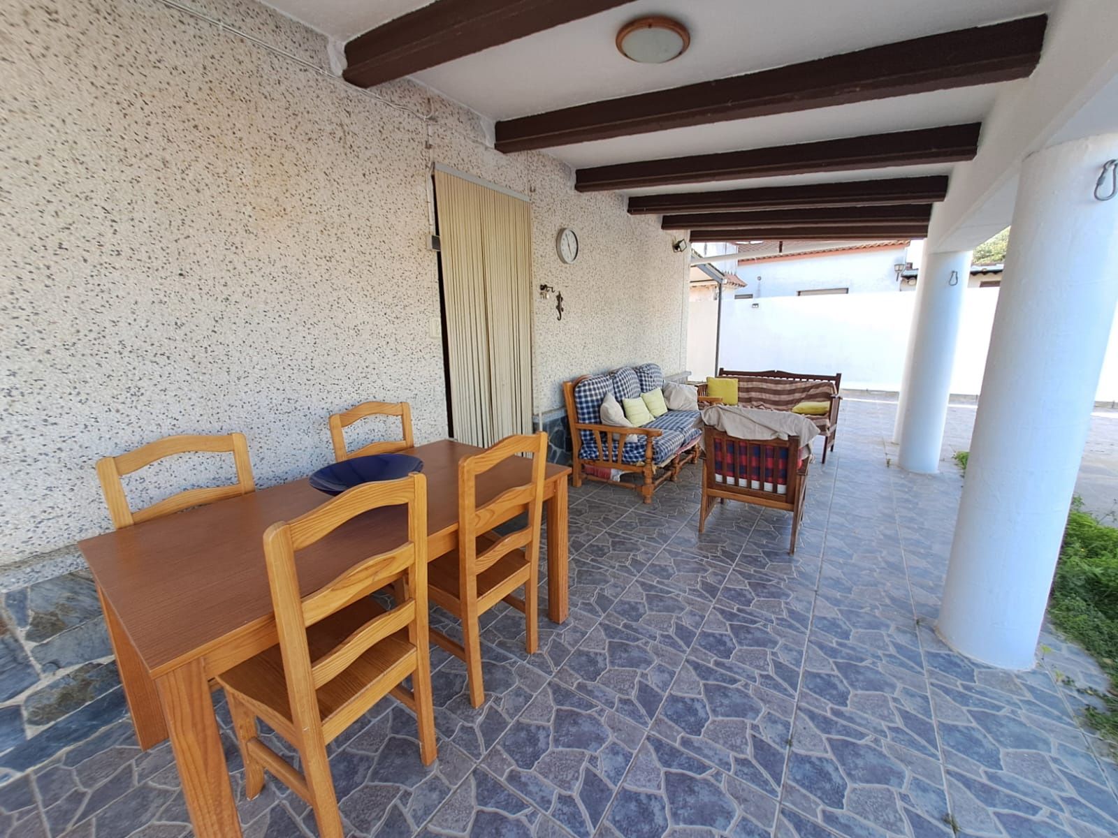 El porche cubierto, equipado como zona chill out y comedor de verano, se convierte en el rincón ideal para largas sobremesas o tardes de desconexión.